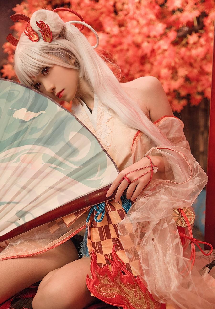 欢迎来到为爱发电,这一期为大伙分享的是由动漫美少女南桃Momoko高度还原阴阳师最美歌姬不知火身穿和服一头白发的cos作品。